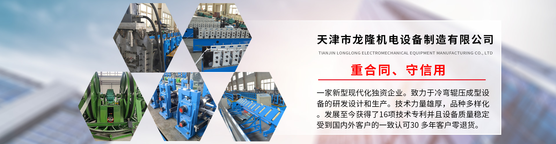 天津市龙隆五金制品厂(天津市龙隆机电设备制造有限公司)成立于1991,是一家新型现代化独资企业。致力于 冷弯辊压成型设备的研发设计和生产。 技术力量雄厚,品种多样化。发展至今获得了16项技术专利并且设备质量稳定受到国内外客户的一致认可30 多年客户零退货。 我们始终坚持“重合同、守信用、顾客至上、平等互利”的原则。诚邀国内外朋友携手合作,共展宏图。